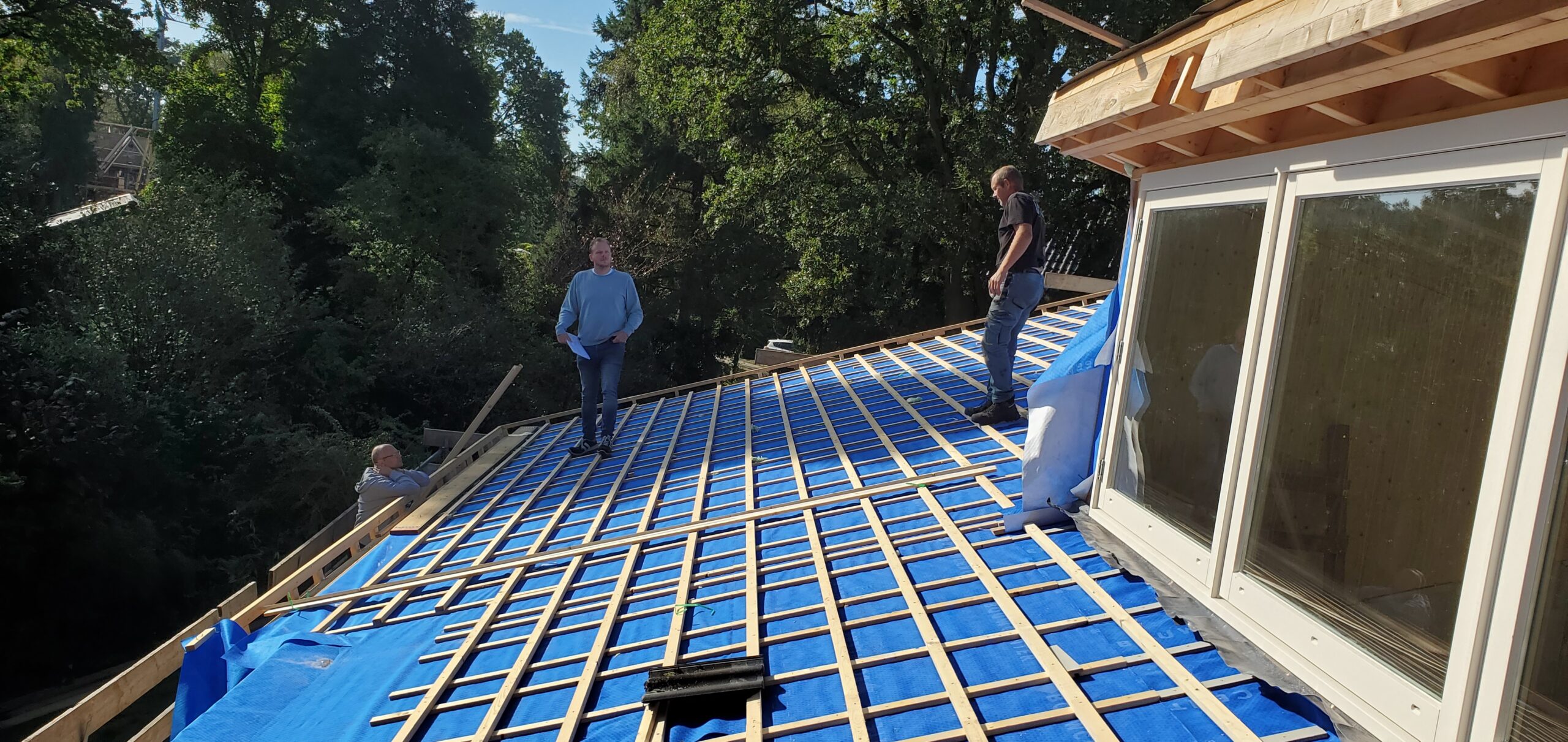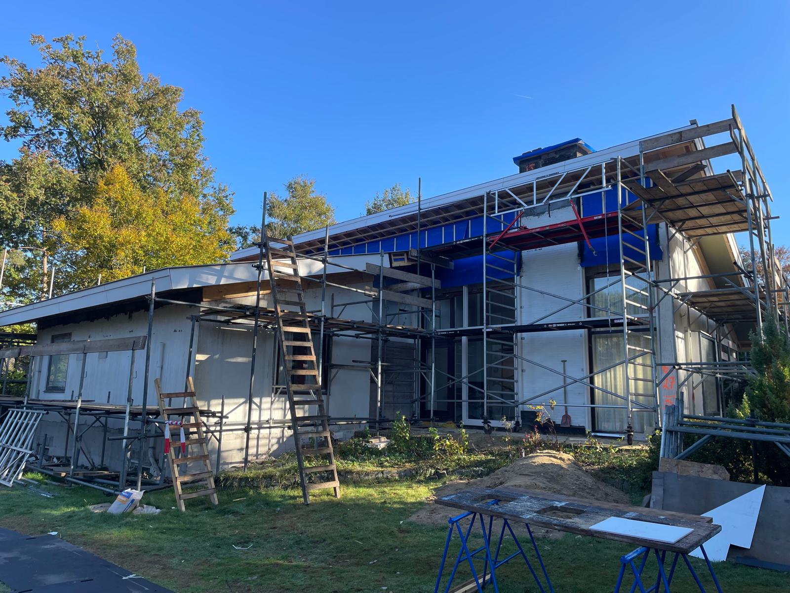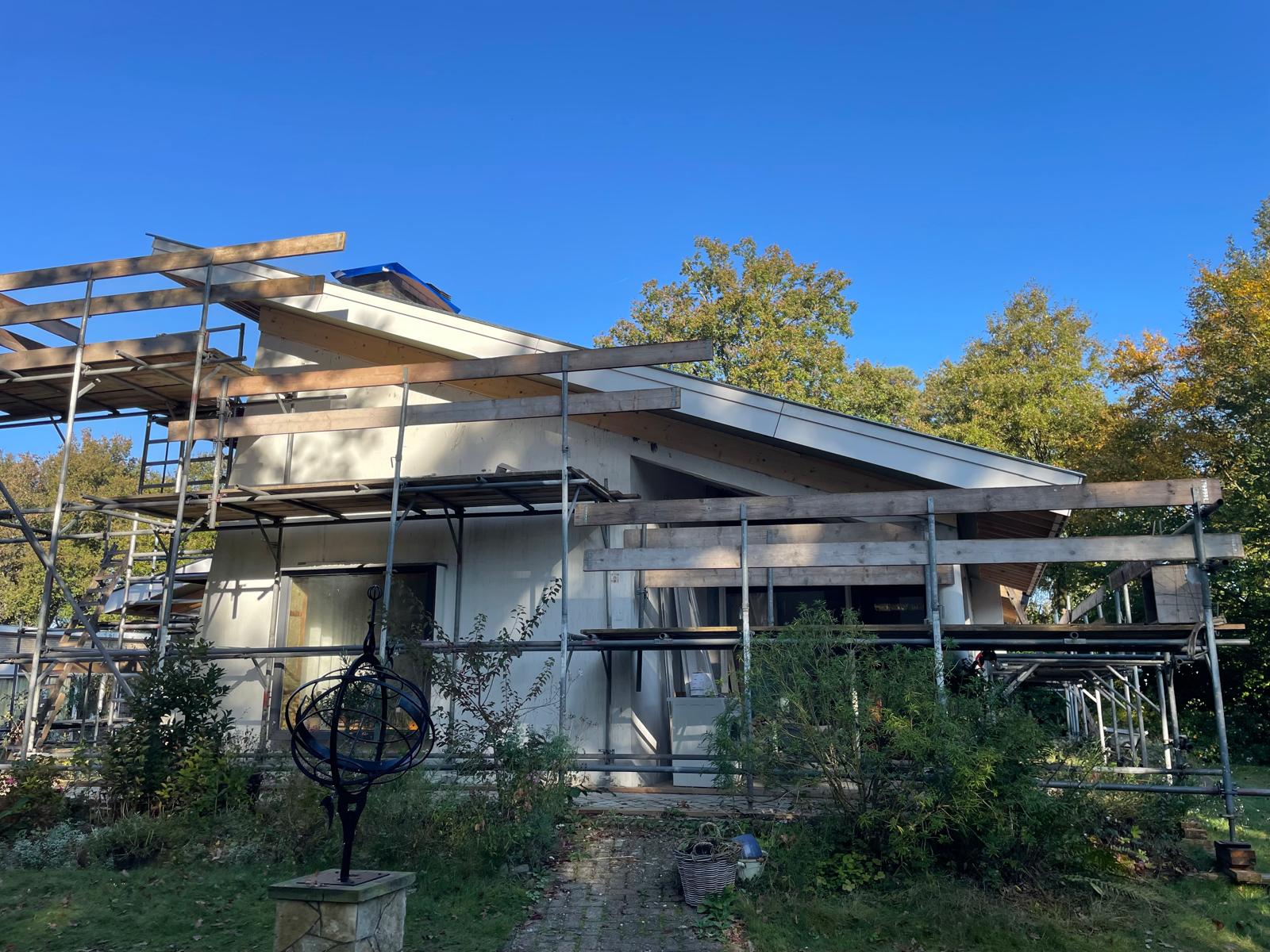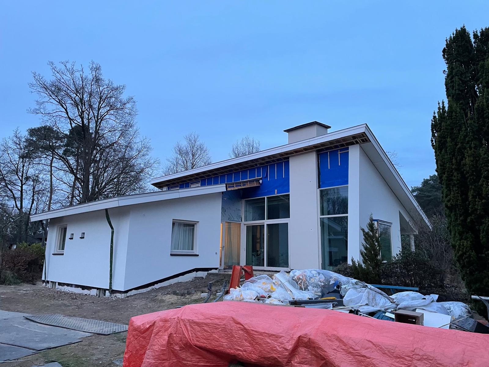 - Dakoverstek aanpassen: Het bestaande dakoverstek werd in zijn geheel afgezaagd, waarna het nieuwe dakoverstek in de lijn met het nieuwe en goed geïsoleerde dak werd gemaakt.